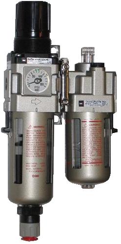 1/2 NPT Stacked FRL unit (all-in-one filter, regulator, luber combination) with mounting bracket. 105 CFM @100 PSI. 5 micron filtration. 7-120 PSI regulation range. Float-style auto draining filter bowl. Uses 10W air line lube with fully adjustable lube rate. 4 1/2 oz oil capacity. Polycarbonate bowls with steel bowl guards. 7.4" Ht. x 8.7" Wd. 145 PSI Max. inlet pressure, 145°F max. operating temperature.